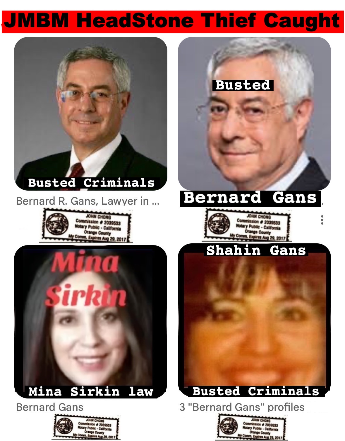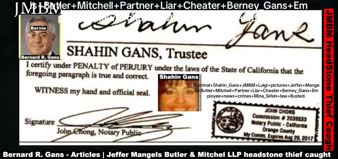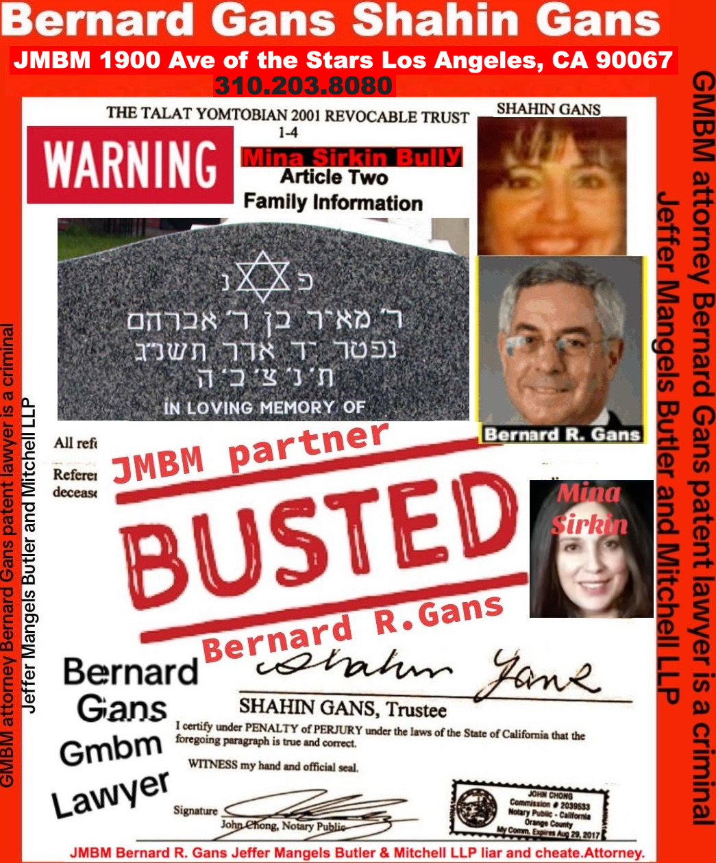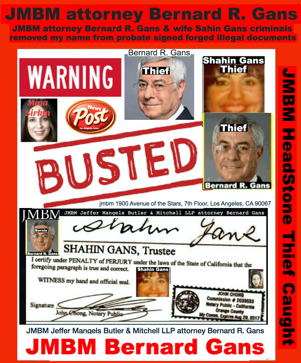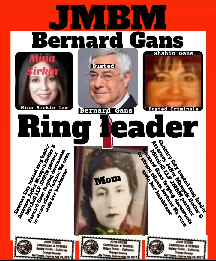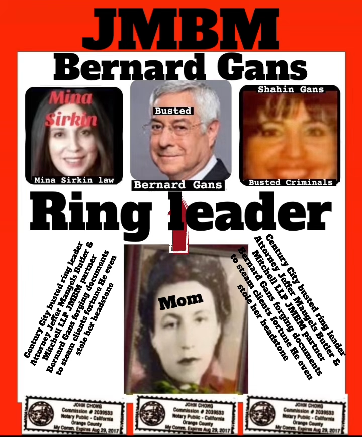76 year old Century city JMBM busted attorney Bernard Reginald Gans # 57068 known as Bernie graduate of Santa Barbara university married to Shahin Gans 50 years of success to satisfy his wife he made one stupid mistake and it all crashed down. Well done Bernie well done.Bernard R Gans Articles Jeffer Mangels Butler & Mitchel LLP