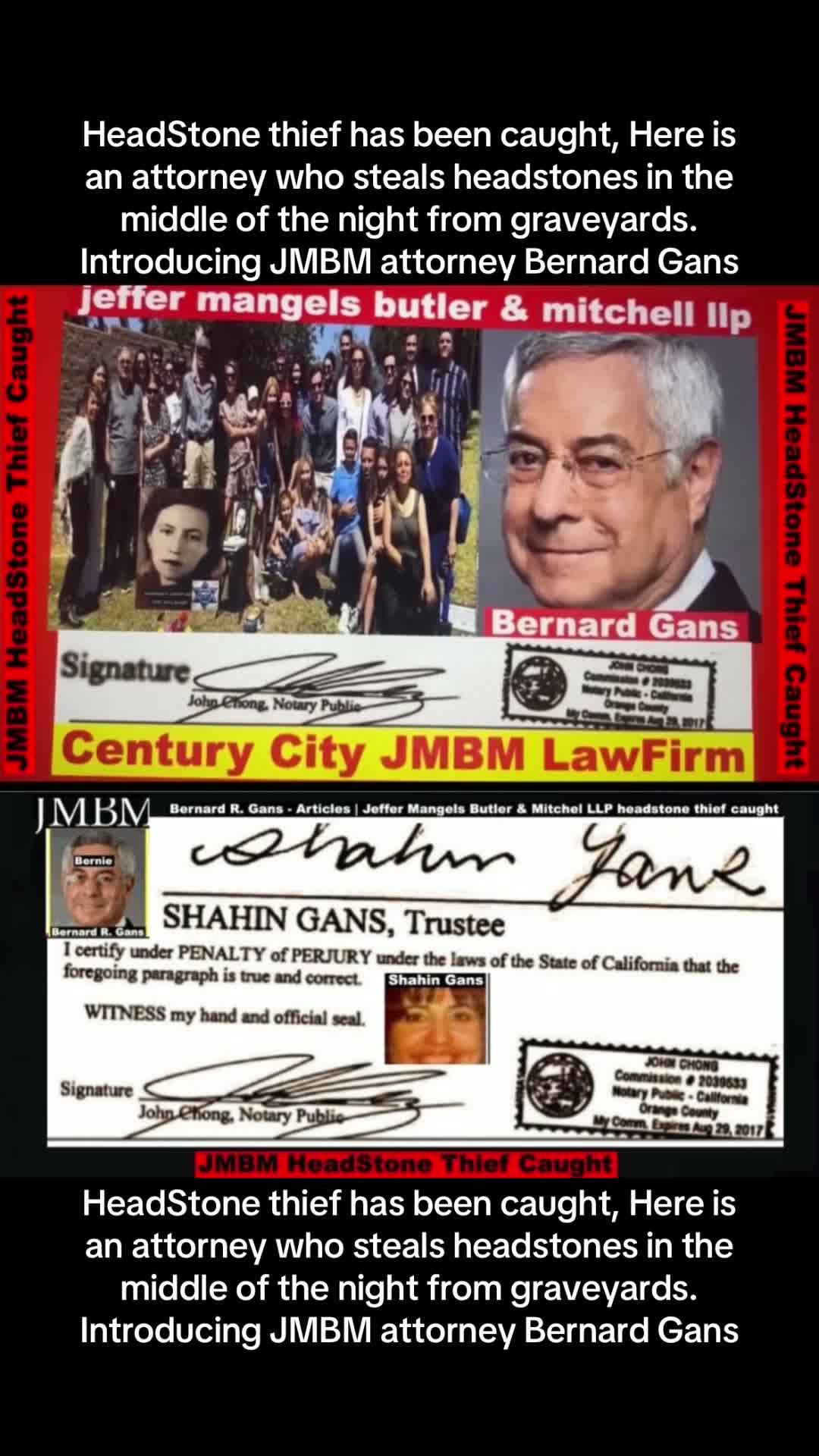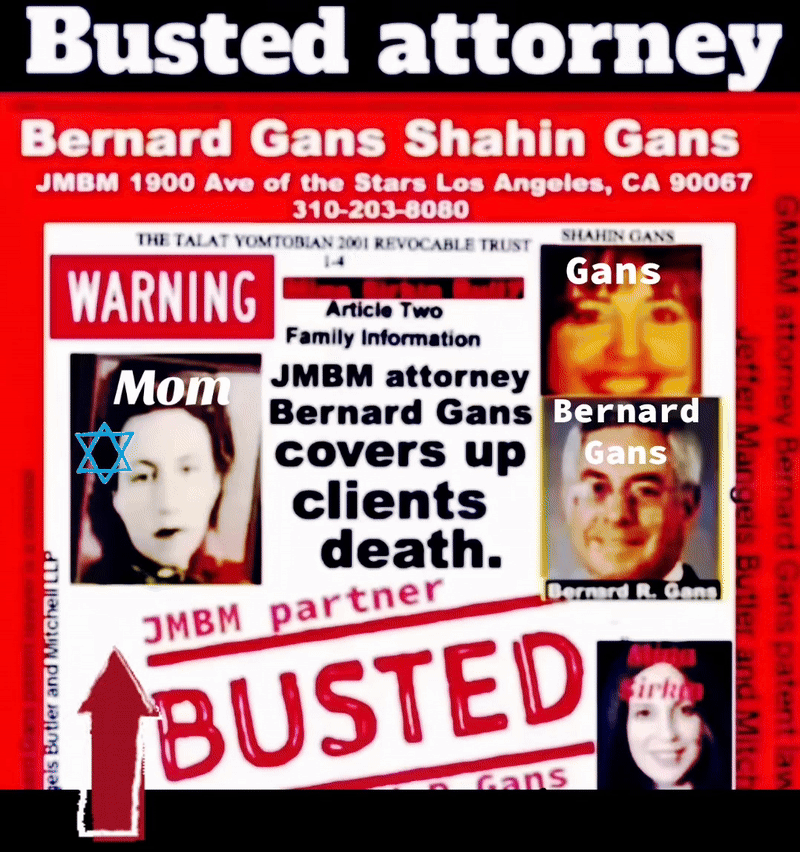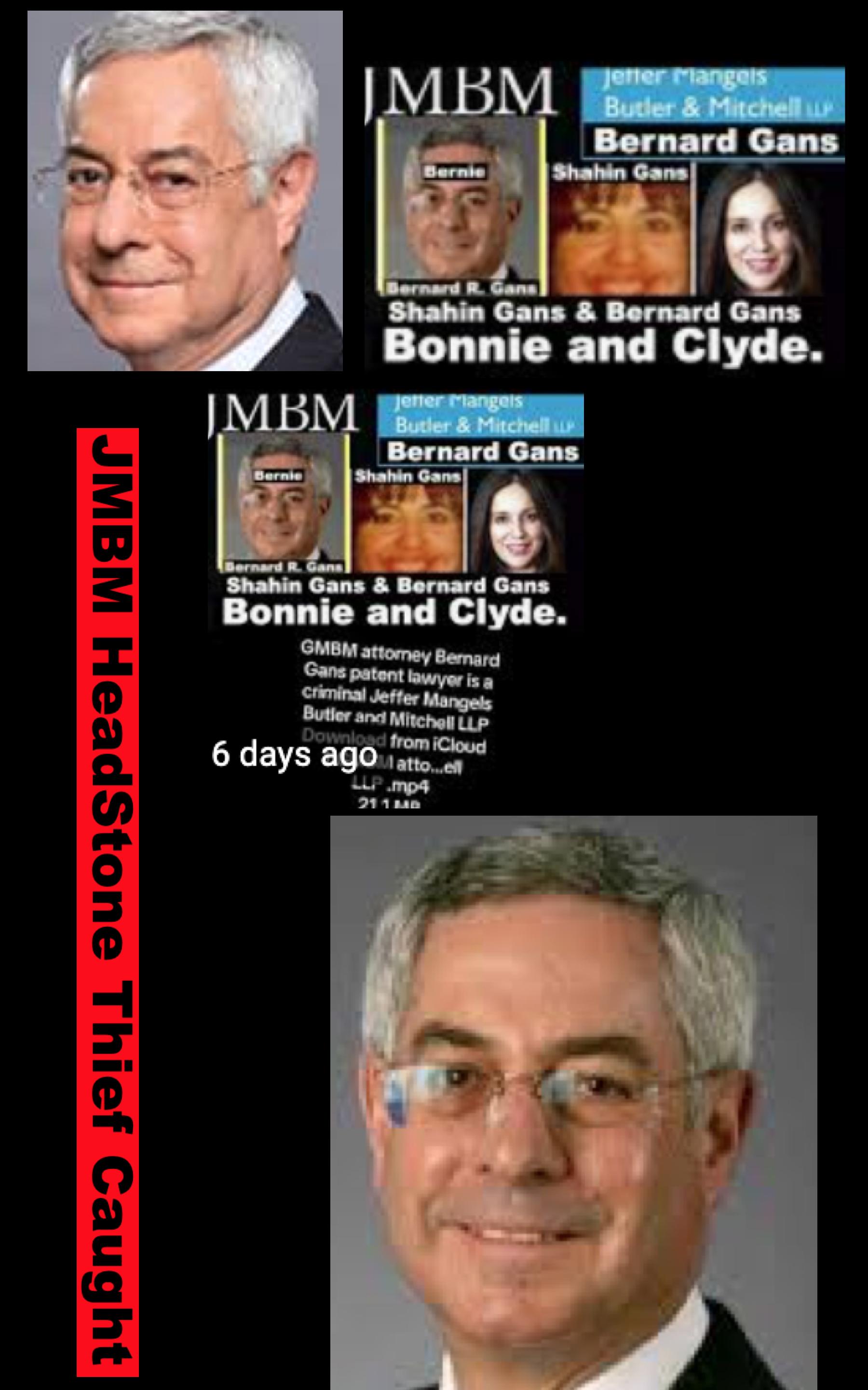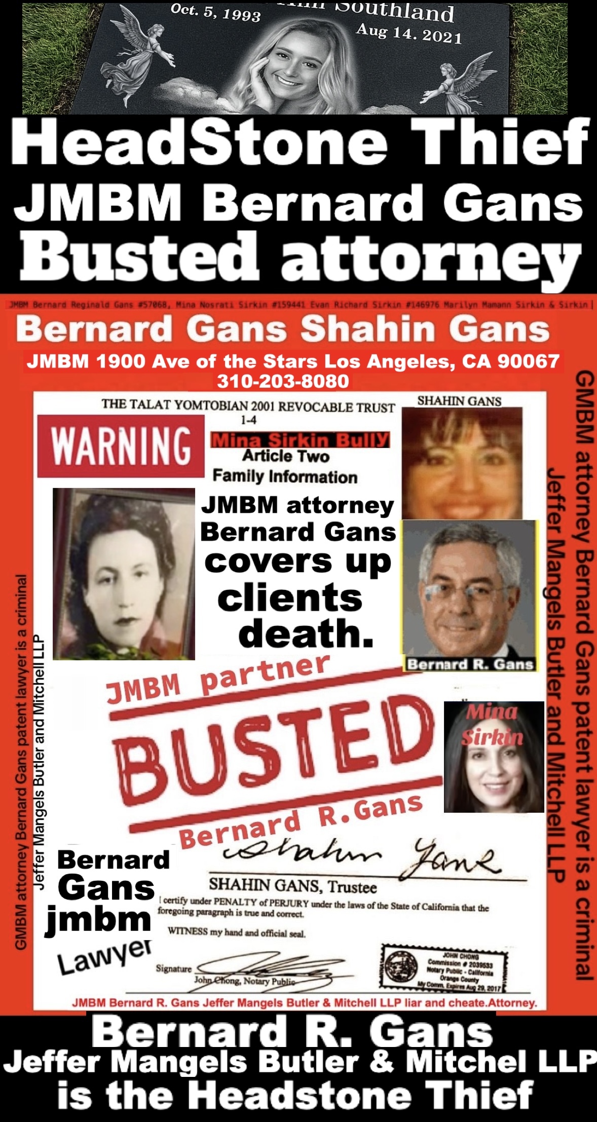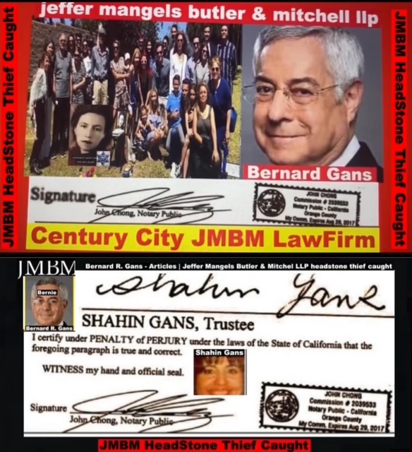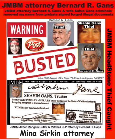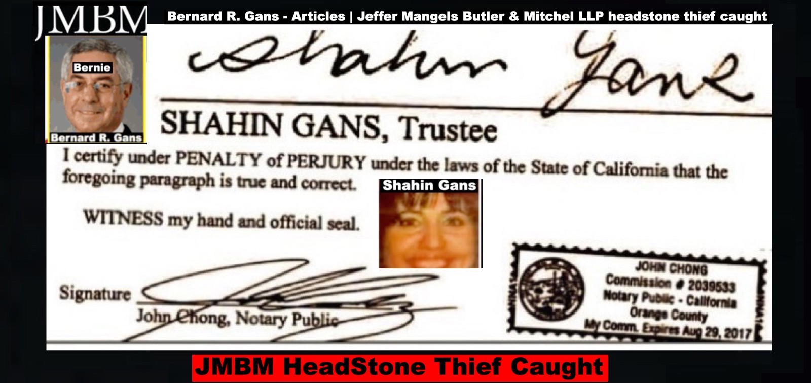 76 year old Century city JMBM busted attorney Bernard Reginald Gans # 57068 known as Bernie graduate of Santa Barbara university married to Shahin Gans 50 years of success to satisfy his wife he made one stupid mistake and it all crashed down. Well done Bernie well done.Bernard R Gans Articles Jeffer Mangels Butler & Mitchel LLP
